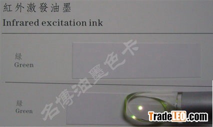 Infrared excitation ink is one of the highest anti-forgery product ,which made of infrared lighten material mixed with binder ,researched and developed with special handcrafted. It looks colorless in appearance, giving off visible light when exposed to infrared light(980nm).with the features of high technology content and high anti-forgery capability.Color: