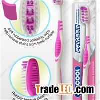 This new toothbrush with rubber scrapers, with tongue cleaner, can provide powerful & thoroughly cleaning.* Standard: EN ISO 20126 ; FDA* The tongue cleaner on the head backside can be applied easily to eliminate tongue surface bacteria, which can guarantee the oral hygiene.* Rubber scraper gently massage and stimulate your gums and help clean along the gum line.Brush head sizeLength33mmWidth13.5mmThickness5mmBristleBrand & TypeDupont Nylon 610 Or Dupont Tynex®ThicknessHARD: 0.25MM MEDIUM: 0.22MM SOFT: 0.18MMHeight11.5mmGrindingAll the bristle ends have been ground to remove the acute angles;Nice Toothbrush With Comfortable Handle And Professional Tongue Cleaner