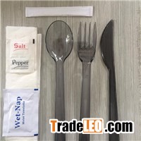 Black Plastic Cutlery Sets Packed with Wet TissueMaterialPlastic (PS)Item No.JX142customizeODM&OEM available ColorCould be any colorWeightKnife:4.5g, Fork:4.5g, Spoon:4.5gSizeKnife: 178mm Fork: 178mm Spoon: 178mm paper napkin 30 x30cm, 2 plyM O Q100,000 setsPackage500 sets/carton or 250 sets/cartonPaymentUsually is L/C or T/TCertificationSGS / ISO 22000 / FDA7in 1 Disposable Cutlery Sets