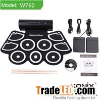 Roll Up Drum Kit W760SpecificationPrice(USD): Qty:1000PCS 26USD/PCS Material: Non-toxic and harmless environmental protection silicone, 100% waterproof Color: Black Or OEM colorOutput: 3WInput: DC5V /1000 MAWeight:(1pc) N.W.:0.8KG/pcs G.W.:1.5KG/pcsG.W:(1ctn) 8KG/CTNCarton Size: 5pcs/ctn L495mm x W365mm x H380mmPacking List: 1 x Electronic drum 2 x Drum stick 1 x USB cable 2 x Foot pedal1 x User manual 1X 3.5mm audio cable 1 x Power AdapterDimension: Silicone Keyboard: L442xW259 x H10mm Panel Box: L220 x W66 x H62 mmFeatures1.Can play with speaker or headphone2.Up to 9Roll Up Drum Kit W760