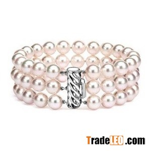 This stunning triple strand pearl bracelet is made of lustrous white freshwater pearls. These pearls are AAA quality, with very high luster and clean surface. The bracelet is strung on silk. Finished with a beautiful 14K gold or sterling silver clasp.Pearl Type Freshwater