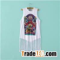 Cotton Gilet with Fringe for Girls Long Fringed T-shirt in SummerVest 054Long Style Short Style Item No.: vest 054 Brand: Can add your embroidery & printed brand logo Service: The print as photo is just for example. You can choose blank or print the picture as your requirement. Color: Casual colors are all available. Fabric: 100% Cotton. Size: 5 sizes in one color. Style: Long style and short style. Accessories: Fringe made by cut not by laser. Season: Summer. Occasion: Daily wear. MOQ: 500PCS in two colours. Our service: Our company are specializing and expeShort Cotton Gilet With Fringe For Girls Long Fringed T-shirt In Summer