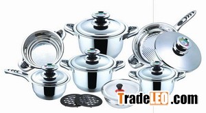 16pcs wide edge cookware set,mirror polish inside and outside.Stainless steel and bakelite combind handle.metal cover with grand thermometer.201# material,0.5mm body thickness,0.5mm alu.+1.0mm item+0.5mm alu. Capsuled bottom.Induction bottom.Size: