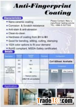 Stainless Steel Anti-Fingerprint coating Grade: 201 / 304 / 316 / 430