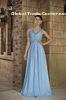 Blue V Neck A-line Chiffon Long Evening Dresses Beads Party Gowns With Lace
