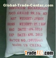 | Description:Ammonium Bicarbonate Food Grade 99.5%min and Sodium Bicarbonate Food Grade 99%min with high quality & competitive price, the annual capacity is 10, 000MT for Ammonium Bicarbonate Food Grade and 150, 000MT for Sodium Bicarbonate Food Grade. Other products, pls visit homepage. Uses: It is mainly used as the foaming agent of such baked goods as bread, biscuits, cakes etc. Additionally, its also widely used in chemical and electronic equipment, etc. Property: White powdered crystalline, with weak ammonia odour, with specific gravity 1.586, poor thermal stability, absorbs moisture when exposed to moisture air, decomposed to NH3, CO2 and H2O at 35 degree centigrade, freely soluble in water but insoluble ethanol and acetone.