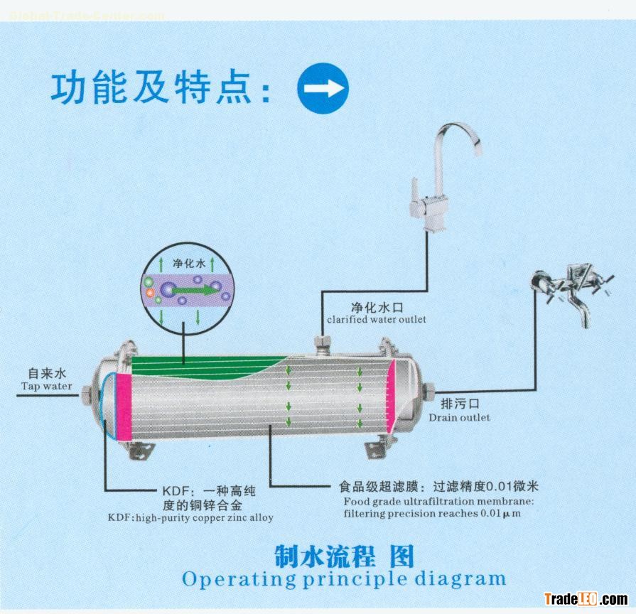 | Ecological heal thy water The new concept about healthy drinking water that is from America Drink healthy water and enjoy health How to drink ecological healthy water to prevent disease£¿ Scientific Method of Drinking: 1£®Water quality: drink ecological healthy water. 2£®Water quantity: at least drink 8-10 cups water each day (about 2500ml). 3£®The optimal time for drinking: a) In the morning after getting up: its good for drinking water since it is emitted when sleep, to clean intestines and stomach, reduce the viscosity of blood, and prevent and cure stone enteritis, hypertension, angina pectoris, cerebral embolism, etc. b) Before sleeping at night: this can prevent myocardial infarction and stroke. c) At rest time before and after exercise to supplement water. d) Half to one hour before meal to accelerate absorption. 4¡¢Do not wait to drink until you feel thirsty and form a good habit of drinking water in time. Drink ecological healthy water scientifically to prevent and cure hypertension, high blood lipids, high blood viscosity, myocardial infarction, cerebral thrombosis, gout, arthralgia, lumbago, cervical spondylosis, high blood glucose (non-insulin-dependent disease), bronchitis, etc. What is ecological healthy water? Tap water is the source of ecological healthy water. After advance treatment, the water is free from matters that are toxic and harmful to human body, but reserve useful minerals and microelements. Therefore the water is natural and clean, people can drink it directly. So, people who drink it for long term will be healthy. What is comprehensively drinking ecological healthy water£¿ Most people think that water for tea should be much better, but for cook does not matter. Comprehensive healthy drinking waterComprehensive healthy drinking means all the water goes into human mouth should be ecological healthy water, not only the water for drinking, but also for cooking. Standards of ecological healthy water: 1£©Free from matters that are toxic, harmful and smelly to human body. 2£©The PH is alkalescent (7.0-8.0). 3£©The content and proportion of the mineral and microelement that human body needs is moderate. 4£©The water hardness is moderate (calculated by calcium sulphate 50/200mg/L). 5£©The dissolved oxygen is moderate (3-7mg/L). 6) The water molecule group is small (less than 100HZ). 7) Solvency, infiltration, pervasion, emulsification, metabolism, cleaning, etc. is strong. Purified water is not ecological healthy water Purified water produced by reverse osmosis and distillation. Beneficial and harmful substances have largely been removed, purified water only contains H2O and shows acidity. If people drink purified water for a long time, the content of mineral and microelement in the body will lose balance and that may cause disease. Do you know that secondary pollution exists in barreled water? When using the barreled water, one liter air with bacteria and dust get into the barrel as one liter water flows out. The quantity of bacteria will exceed in standard in a few days as the breeding cycle is counted by hours or minutes. So experts consider that the quality of water can¡¯t be guaranteed two days after opening. The present drinking machine with the highest temperature in 90? and the lowest in 7? is incapable in sterilization. To drink that water directly is worrying. What is Dual Water Supply£¿ Dual Water Supply is the concept of dividing the tap water into high quality water and back washing water. The harmful substances are removed, while the minerals and microelements beneficial to human health are retained in the high quality water to meet the Standards of High-quality Drinking Water. Meanwhile, the backwashing water is used for daily washing, so that the water resources are fully utilized. Comparison of DA household Drinking Water Filter , bottled water and water purifier Application Scope DA Household Drinking Water Filter is widely used in housing district, villa, high-grade apartment, home, hotel and office building for purifying the tap water. DA household drinking water filter adopts the concept of different quality water supply and modern technique of membrane separation aperture ¡Ü0.1um) which eliminates suspended solid, corpuscule, atex, algae, bacteria and organic macromolecule in tap water. The echnique also makes the water partially alkali and remains the mineral and microelement which are beneficial to human¡¯s health. At the same time the backwash water can be used for daily life using, so the water resource can be utilized fully and the service life of membrane will be prolonged. Application of DA household Drinking Water Filter |