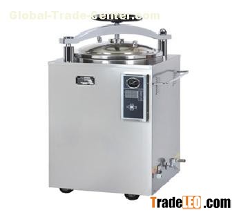 the vertical pressure steam sterilizer is installed with an electrical heater, a timer, a pressure-temperature controller, a safety valve, a releasing valve, a pressure-temperature indicator, an alarm bell for finished sterilization and an instrument to automatically cut off the power of heater. It has the advantages of effective sterilization, convenient operation, safe, less electricity consuming and cheap. It is ideal equipment for clinics, scientific research institutes and other organizations to sterilizer surgical instruments, fabrics, glasses, culture media etc.