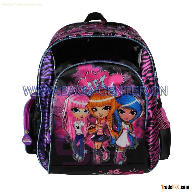 Keywords: Custom CMYK Printing Backpacks, 40*30*14 cm, Leather Match Satin, Rubber Puller, Glitter PVC Piping.