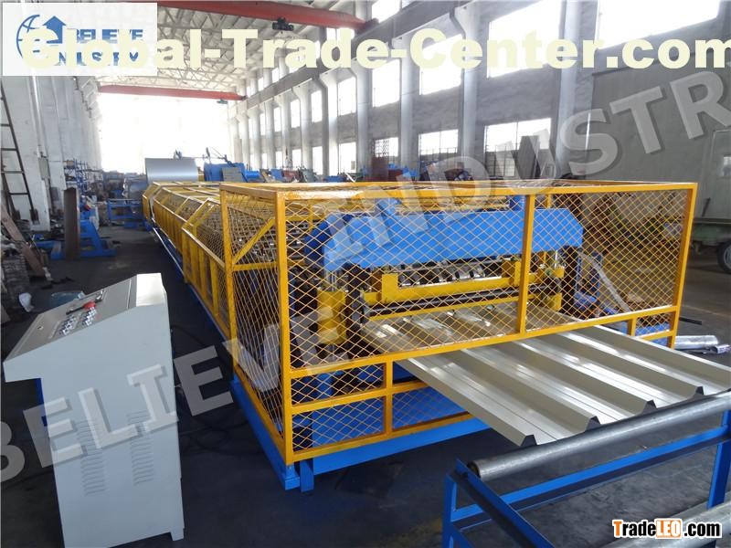 This roof panel forming machine is suitable for manufacturing colored steel roofing panel. The machine includes decoiler, roll former, cutter, hydraulic pump station, product table, and cabinet, etc. Its normal material thickness is roll coating with 0.3-0.8mm, and its forming width is equal to or less than 1250mm. The specific roof panel profile can be designed and made in line with customers' specific requirements, such as corrugation shape, ladder shape, and IBR, etc.