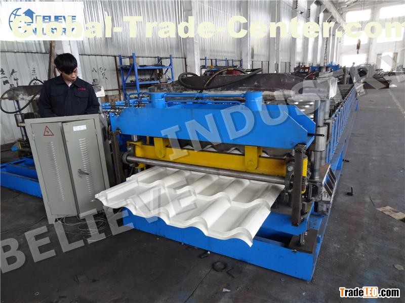 This metal Roof Tile Roll Forming Machine can produce metal roof tiles. Main components of this machine are decoiler, guiding and leveling device, roll former, hydraulic cutting device, collecting table, hydraulic station, etc.