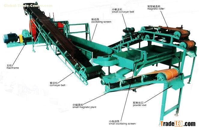 Waste Rubber equipment from the equipment and the decomposition of waste tire rubber powder crushing and screening unit composed of magnetic carrier. Through the decomposition of waste tire facilities, tire first processed into 3.5 cm square pieces; then mill group (XKP400/450/560 type) of the plastic blocks have broken ground wire mixed powder, particles; then powder screening magnetic transport unit will be complete separation of wire and tire rubber. Through the conveyor belt through two sieve beds filter out the fine material via magnetic roller, magnetic separation of the wire, the system obtained 10 orders -40 present pure powder fineness (fineness optional). Below standard mesh fineness of powder materials by conveyor to return block grinding mill again, this cycle of advanced grinding technology, without any chemicals, no gas, no water, low operating costs. Magnetic wire results of 99% to XKP450 type, for example, the total installed power 80KW, 1 ton per tire processing power around 200 degrees, output 200-400 kg per hour (to obtain powder of different fineness, yield also different), is to use the best steel wire tire rubber powder production equipment