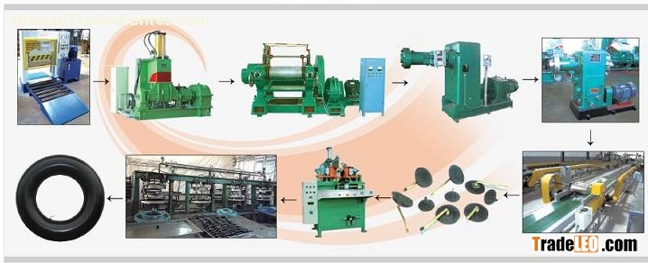 Tube production line equipment including vertical rubber cutting machine, mixer, rubber mixing mill, rubber strainer, rubber extrude production line, tube splicer, tube curing press and other equipment.Inner Tube Production Line is suitable for motorcycles, bicycles, electric cars, trucks, engineering tube production. This line is energy-saving and advanced international standards.