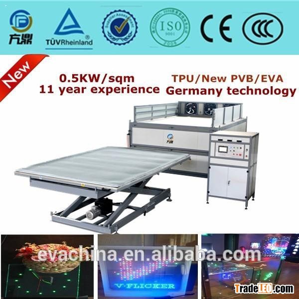 -Kinds of laminated glass processing. Fangding EVA and PVB bending laminated glass machine can adopt EVA film, TPU film to produce kinds of laminated glass, including architectural laminated glass, tempered laminated glass, flat laminated glass, bending laminated glass, top grade decorative laminated glass, silk laminated glass, bulletproof laminated glass, armored glass, LED laminated glass, switchable laminated glass.etc.