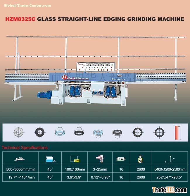 Technical Specifications:The number of motors:8Grinding speed:500~3000mm/minMax arris angle:45°Thickness of processed glass: 3 ~25mmSize of processed glass:MAX:3000 x 3000mm MIN:100 x 100mmTotal power:16.3KWWeight:2800 KGSize: 6400(L) x 1200(W) x 2500 (H)mm