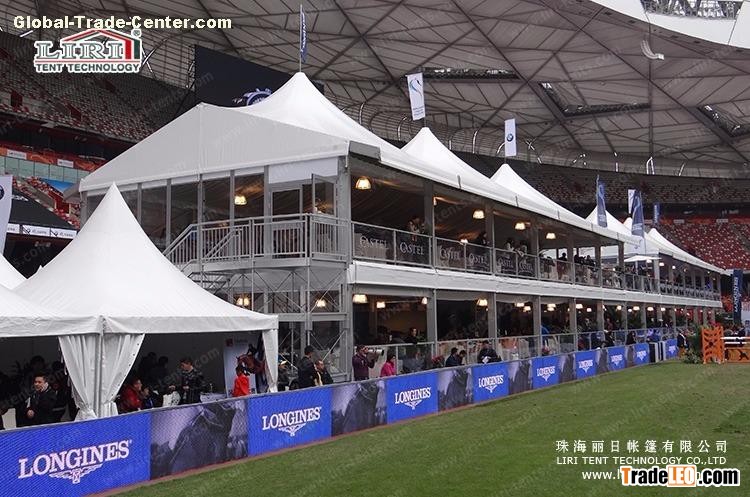 Double Decker Tent for Golf Events, Two Floor Tents for Sale1. Application of Double Decker Tent for GolfIt is equipped with glass wall, ABS wall, decoration roof lining, inside curtain, pagoda tent entrance.The tent series are widely used as the party tent, wedding tent, exhibition tent, conference tent, festivals celebration tent, corporate events tent or other events, etc.