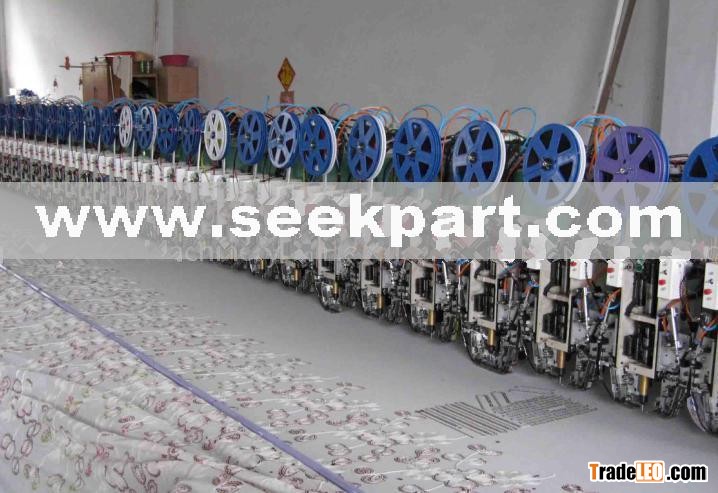 22 heads of this style machine can embroidery 5.5yarn material in width, and 32 heads machine can embroidery 7.5yarn material in width. Schiffli machine is 15 yarns in width. 2 pieces work of material is equal to one Schiffli machine work. And what’s more it can perform the designs which Schiffli machine cannot make. For schiffli machine can make only small design, cannot make big designs, and it has only single color, cannot change colors, and it’s too difficult to change the cloth. But our latest chain machine can perform small designs and big designs, and it has 3-6 colors, and what’s more it’s easy top change cloth as you want at any time. The minimum head interval is 216mm, and you can design more small stitch according to your requirement. And it has 32 heads, high efficiency. If you adopt the needle of No.20 or No.21. Then it can use wool to make the embroidery, very big stitch and very beautiful.