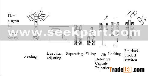 normal style="MARGIN: 0cm 0cm 0pt">When the machine starts,the capsules in chute will come into the selection fork of distribution device vertically one by one;when the selection fork runs down ward,it will send a row of capsules into slot.Through the directional push of fiddle fork and the operation of selection fork,each capsule will be installed in module hole,pressing the cap with upper body lower.