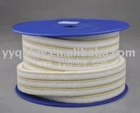 White PTFE Packing with Aramid Corners: The packing is produced by intertexture of white PTFE lines and Aramid fiber, with Aramid fiber getting strengthened in diagonals. The packing can be widely applied in high-pressure working environment. Its structure can not only compensate the lubricating property of Aramid fiber, but also improve the strength of PTFE. White PTFE packing with Aramid corners is designed for reciprocating pump under high-pressure, centrifugal pump with moderate speed and valve. It possesses many advantages including good strength of Aramid fiber, great abrasion resistance of white PTFE and good heat conductivity. It is capable of being applied under the normal working environment to such media as steam, coal, dissolvent, neutral acid, neutral alkali and most easy-to-wear media. It cannot cause pollution in the industries of papermaking, food and sugar refining. White PTFE packing with Aramid corners has much better lubricating property and heat conductivity than others. It is widely used for reciprocating pump, mixer, reactor and valve in the industries of petrochemistry, papermaking, sugar refining and power plant. White PTFE packing with Aramid corners is produce by the intertexture of multi-threads, with Aramid fiber impregnated in the PTFE getting strengthened in diagonals and the seal body being weaved through pure PTFE threads.