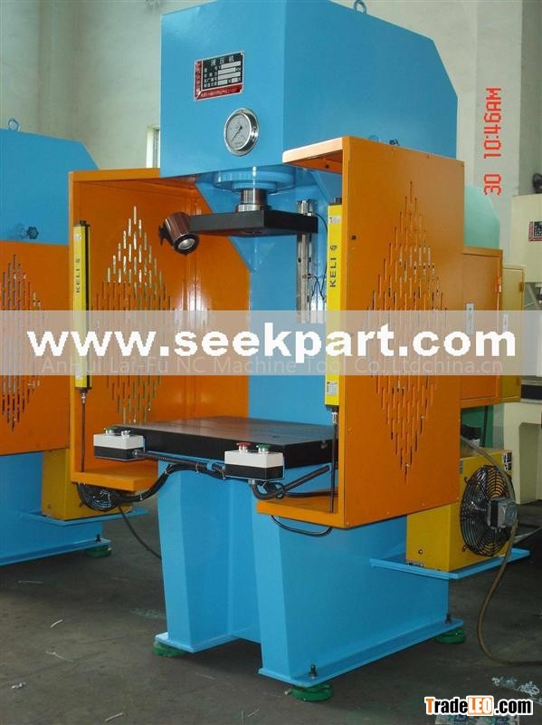 C-frame oil hydraulic press can be used for achieving cold and heat processing of compression molding forming,rollingalignment,edge bending,manufacturing of container and enclosure,and tube flaring of steel sheet and sectional materials.The work piece can approach the woring area from three positions due to the C-frame machine body.In addition,a pair of manual or electric-operated booms is provided for disassembling the mould and mounting the large work pieces.The press is characterized with reasonable structure,complete functions,reliable performance and convenient operation and maintenance.
