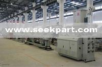 PE pipe extrusion line includes 3 conical extruders, modifying distributor, die, caliberation unit, chilling unit, hauling unit, cutting unit and stacker. The whole line has reasonable design, advanced technology, stable production. Its products feature various colors, beautiful shapes, low price, environment-protection, lightness, toughness, heat and noise insulation, water proof, corrosion resistance, quake proof, antifire and insulation. These products are the best materials for construction uses.