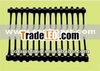 Uniaxial geogrids are a kind of high strength geosynthetics which take high molecular polymer as main raw material, and add the additives of anti-ultraviolet radition and anti-aging; then through directional stretch, original scattered chain molecule is realigned at linear state. According to physical characteristics of high molecular polymer, under the condition of certain temperature control, plastic geogrids are stretched at certain direction, so they have high tensile strength at this direction. Their tensile strength is 100-200 Mpa and elongation is only 4-10%, which nearly approach the level of mild steel and they have much advantage over traditional and present reinforcement materials. So they are a quite ideal geosynthetics for strengthening civil engineering and reinforcing road base.