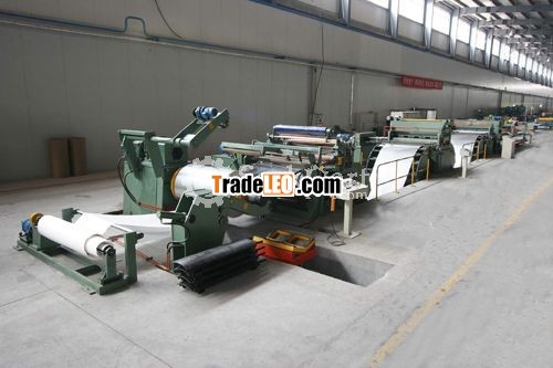 The slitting line composed of uncoiler, hydraulic primer head, shovel head, feeding, straifhten, leveling insitution, shearing device, predictly seperate material,damping devic, recoiler device.