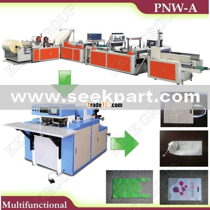 This multifunctional non-woven bag-making machine is dedicated to producing soft-packing bags, such as vest bag, flat bag, handle bag, shoe bag, bag, etc.