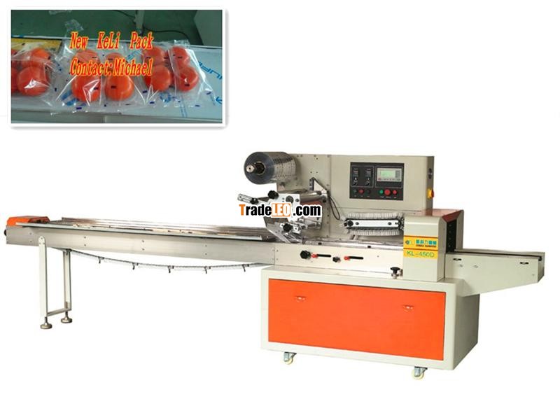 fresh tomato packing machine automatic with tray package I tem: KL-450D Film width Max.450mm Bag length 130-450mm Bag width 60-200mm Product height Max 90mm Film roll diameter Max.320mm Packaging rate 30-180 bags/min Power 220v 50/60Hz 2.6kw Machine size (L)4020*(W)820*(H)1450mm Machine weight 800kg Features : 1.Double frequency conversion control , bag length can be set and cut in one step , saving time and films. 2.Adopt PLC & HMI programming software , easy operating and setting . 3.Self failure diagnosis , clear failure display . 4.High sensitivity photocell tracing , input cutting & sealing position digitally , extra accuracy . 5.PID control temperature independently which is more suitable for packing different materials . 6.Positioned stop function , without sticking knife and saving film . 7.Simple driving system , reliable working , convenient maintenance. 8.All control is realized through software , easy for function adjustting , technical upgrade . 9.Design of mechanical structure is simple & reasonable , which makes the operation easy and reliable. Application : This machine is suitable for pack biscuit , vitellus-pie , wafer biscuit, bread , ice cream , mooncake , candy , medicine , hareware , towels, tissues, noodles, egg rolls, sausage, squid, lollipops, cutlery , inflight meal , etc