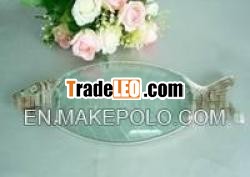 GLASS FRUIT TRAY, FISH DESIGN, WITH ZINC ALLOY MATERIAL, ALSOSILVER FINISHING, CAN PACK FOOD OR DISH OR FUIRT, VERY GOOD PRICEAND HIGH QUALITY.