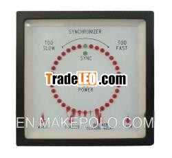 Synchroscope 6714 6714 synchroscope is a high-techdesigned product, there is no need to install synchronouscontrollers when using synchroscope so the cost of generators andmachine control cabinet is reduced and the line is simplified. Andwhat's the most important, it improves the stability of generatorsand machine control cabinet. The functions ofLED 36 LED in a circle When it issynchronous, the phase difference is near 0°, the top green LEDshall be lit. When fgen>fbb, the phase difference is in timingangle, LED shall be lit in the direction of "TO FAST", a phasedifference of 10°will be increased when a more LED is lit in thatdirection. When fgen SYNC The LED shall be lit when thephase difference is lower the presetting difference. DCPOWER The LED shall be lit when the power issupplied. MAINS The LED shall be lit when electricnetwork or Bus-bar is suppliedpower. ENABLED The LED shall be lit when thesynchronization is been accepted. BREAKER CLOSURERELAY The switching signal shall be showed synchronously ifthe phase difference is lower than presetting difference andmeanwhile the LED is lit when the synchronization is beenaccepted. GEN The LED shall be lit when generator issupplied with power. ISO9001 CertificatedFormore information, please feel free to contact me. ^_^Synchroscope 6714