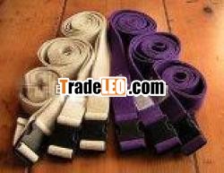 Durable 100% organic cotton webbing stretch strap is easy to threadand adjust thanks to its sturdy metal D-ring. 8' strap in naturalonly; India. A Gaiam exclusive!