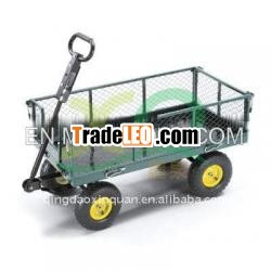The wagon box made of steel meshand the side frame can fold down or detach completely. The bottomdeck supported by 4 flat steel rib. The handle could unload andconnect the cart with mobile vehicle. In order to loading goodspreferably, you can put plastic plate on the bottom of wagon box,put corresponding canvas cover and steel basket on the wagonbox.
