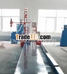 Advanced Machines Make Quality FRP Pipe Liners Liner makingmachine, as its name implies, is specially designed for fabricatingthe liner layers of fiberglass reinforced plastic (FRP) pipes. Ithas auto resin spraying device and Taida PLC numerical controldevice. Thus, resin can be sprayed in accurate quantity to preventwaste phenomenon. Meanwhile, the film, mat and grid fabric arewinded automatically to the mandrel by a trolley movinghorizontally along the mandrel. Equipped with tension brackets, ourliner making machine allows for smooth & precise lap jointswithout any artificial nonconformity and inaccuracy. Meanwhile, itadopts frequency conversion linkage control system between themandrel and moving trolley, that is to say, the trolley can move indifferent speeds accompanied with the mandrel. In addition, thetrolley moves smoothly by gear wheel and it has monitor platform toconvenient control & operation. An orange liner making machinefor producing FRP pipe lines. Liner making machine for linermanufacturing of FRP pipes.A red liner making machine equipped withTaida PLC device allows for accurate control. Liner making machineis equipped with Taida PLC device for accurate control.Composition: Liner making rails. Liner making driving headstock.Tail stock. Liner making trolley. Taida PLC numerical controldevice Resin delivery system. Spray heads. Pneumatic pressing roll.Polyester film winding stand, etc. Details: Pipe diameter of linermaking: up to 2600mm. Workable length: up to 12m. Rotation speed:3r/min to 30r/min. Speed of trolley: 9m/min. Machine height:1600mm. Covering areas: 38m �� 19m �� 2.8m (L �� W �� H). Loadcapacity: 7.5kW.Liner Making Machine