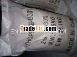 Properties: Whitepowder. Specifications:Item | Standard | | B301 | B311 | | Ba SO4(as ZnS) | 99%min | 99%min | | Zinc (asZnS) | 28%min | 30%min | | Zinc Oxide | 0.6%max | 0.3%max | | 105âÂÂÂÂÂ????ÂÂÂÂÂ????Volatile | 0.3%max | 0.3%max | | WaterSoluble | 0.4%max | 0.3%max | | Screen residues (63ummesh) | 0.1% max | 0.1%max | | Oilabsorption g/100g | 14max | 10max | | Color Killing (Compare with standardspecimen) | 105%min | 105%min | Packing: 25kg P.P. bag. 20MTin 1x20''FCL Applications:Lithoponeis a white pigment composed of a mixture of barium sulfate (68 - 70%) and zinc sulfide (28 - 30%) with trace amounts of zinc oxide. Itis produced by precipitation through filtering, heatingand quenching works. Lithopone has mostly beenreplaced by titanium dioxide which is more durable, but itis much cheaper. It is used as a base for lake pigmentand used as a inert pigment for paint, ink and cosmetics as wellas in a large range of applications in plastic industry.It is used as a filler in paper, leather, andlinoleum. |