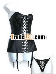 Black leather teddy with garter and metal D rings for laces. Sizes:Small - 2XLarge. Shown here with 4465-35 g string.Women''s Leather Tops andBras