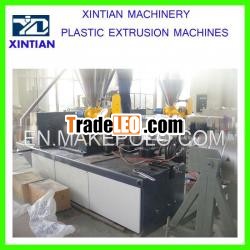 This production line consists of conical(parallel) double-screw extruder, vacuum sizing platform, tractor,cutting machine, stacker, etc. The conical (parallel) double-screwextruder and tractor adopts AC frequency control or British Euro DCspeed regulator. Vacuum pump and tractor adopts high-qualityproducts. Tractors can be divided into up and down pedrail,three-claw, four-claw, six-claw, etc. in terms of thickness anddiameter of the pipe. The cutter has two modes of cutting such asblade and planet type. Additionally, metering device is equipped.The property of the production line is reliable and the output ishigh.