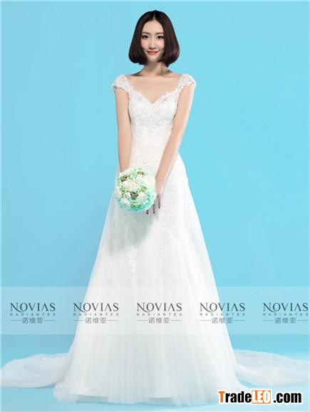 A-line sweetheart applique beaded embroidery drop waist beaded chapel train wedding dress